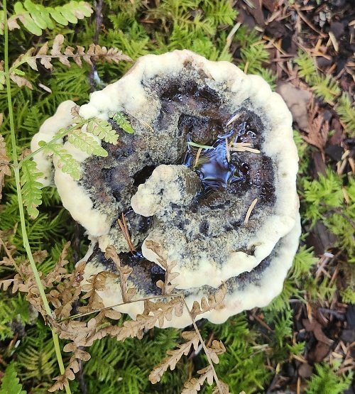 The mushroom weighed in at 150 grams, but it was still quite wet, so I used just 50 grams of wool yarn. First I put the mushroom in a large jar and just covered it with water, then covered it loosely with a piece of foil; then the iron-mordanted fibre went into another jar of plain water. Both jars went into my largest soup pot, with a cake-cooling rack underneath (I could have also used a folded tea towel to keep the jar from direct contact with the bottom of the pot). Then I added water to the pot until it reached the level of the jars’ contents.