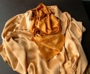 At the same time, I found myself wondering what to do with a silk blouse that had a stain on the front. Aha! I thought. Let’s see if it can pick up any colour, and if the colour’s uneven and blotchy, so much the better.