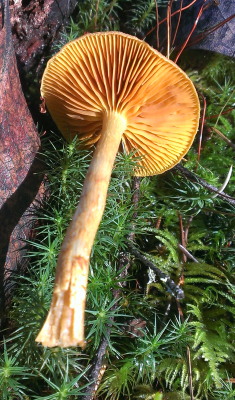 We clambered over moss-covered rocks, sweeping back and forth across the bluffs, and soon my little brown paper bag was full, of both the yellow-gilled and red-gilled beauties, and I had to start on another bag.