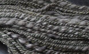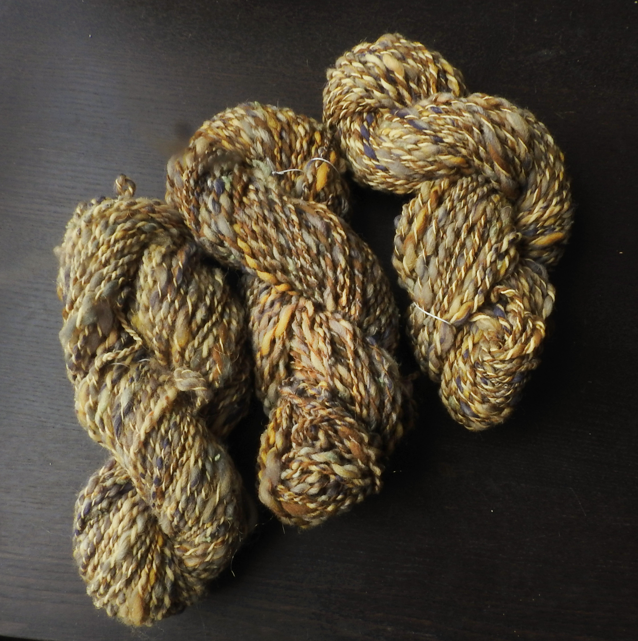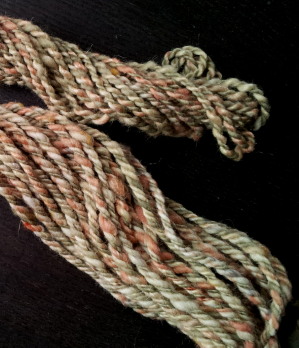 The batt I described in my last post spun up into three good-sized bobbins. I had added a handful of silk noil, then spun thick and thin to get a nubbly texture. Then I spun thinner ply yarns from these two colours: