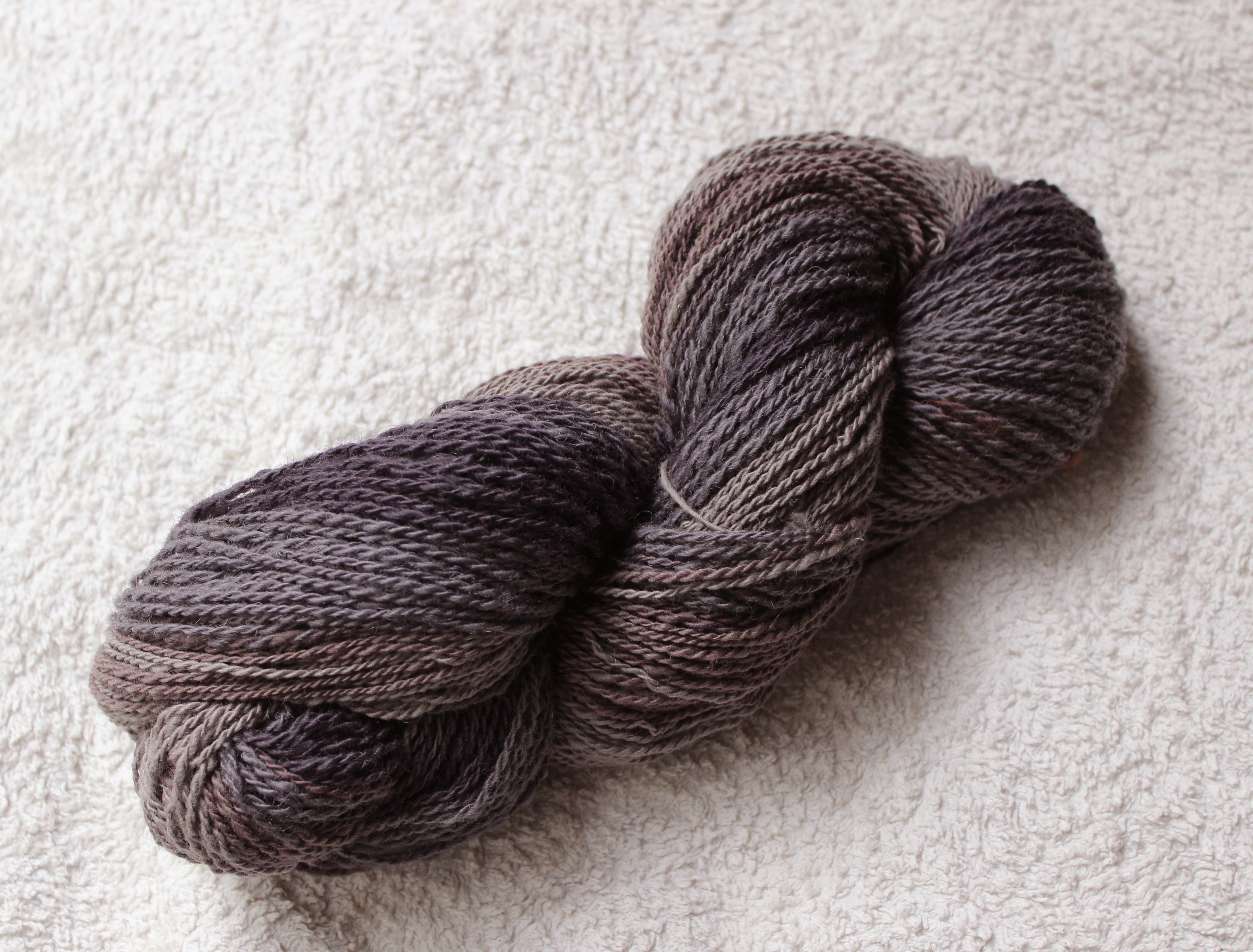 When I sat down to spin the lovely Omphalotis purple, I decided to keep separate the six different shades that emerged from successive exhausts of the same dyepot. So I split the wool of each shade in two and, working from darkest to lightest, spun two plies of about the same length and with the same gradations of colour. These I plied together into one skein.