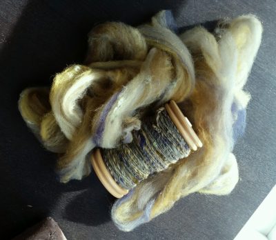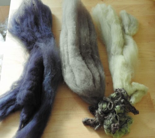 Blue/green wool on the left, with a bit of angelina: Mystery lichen (more about this later);