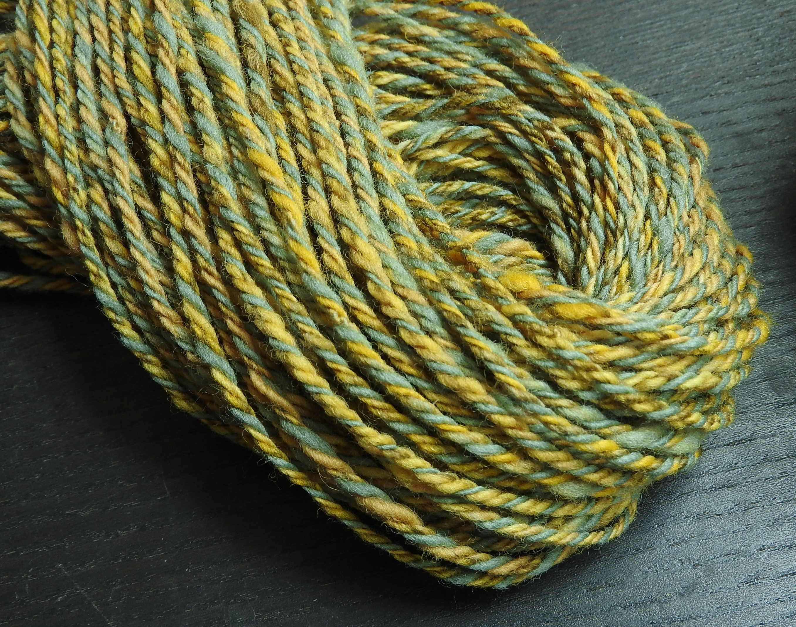 They did leave me with a few, though, and these gave me a really wonderful green, enough for one of the plies in a three-ply chunky yarn, with what was left going into a smaller skein of two-ply.