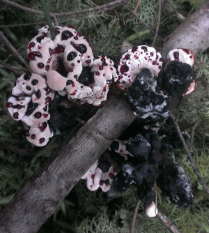 I love how these and other toothed fungi engulf whatever’s in their way. This one had not only eaten a couple of sticks, but it was doing its best to devour a branch in its path.