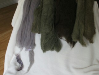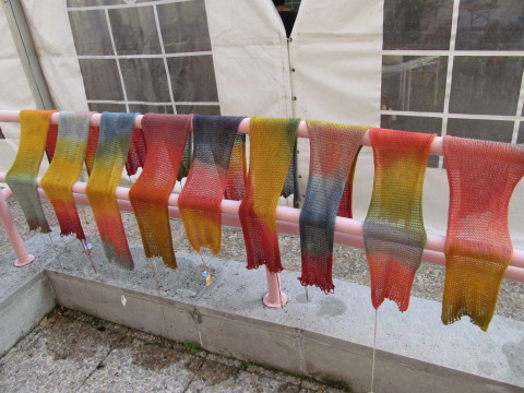 This was an interesting project. It started with machine-knitted “blanks”—rectangles knitted in double strands of white wool. Workshop participants dyed these blanks in three different dyepots, so they looked like this (mine was fourth from the right).