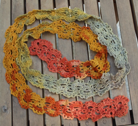 We then took our blanks home and ravelled them. I ended up with a length of yarn that, when folded in half, had identical colour shifts (because the yarn was doubled during the knitting). I looked for something that would take advantage of this symmetry, and found it on Ravelry: Queen Anne’s Lace Scarf.