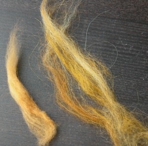 I dyed some llama rovings in a Phaeolus dyepot (the three strands of fibre on the right—mordanted in copper, iron and alum, left to right)—and I love the gentle way they picked up the colour.