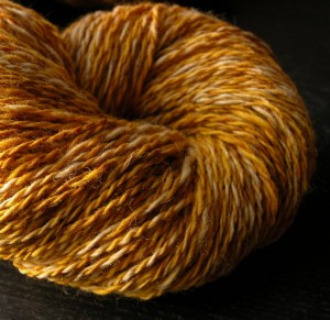 I also had some mohair locks that just soaked up the brilliant gold. I cut these into manageable bits, which I encased between plies of the merino. Unfortunately, it didn’t go very far—next year I’ll have to dye much more than a couple of handfuls—but this little skein is magic and would be good to use in combination with the merino yarn.