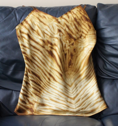I like this short, stout bottle because when I stood it upright in the dyebath (having filled it with plain water for stability), the camisole was completely submerged. After a good simmer in the rich colour of a few fresh buttons, I removed the bottle and immediately painted the outer folds with a concentrated copper solution.