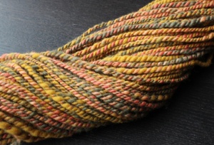 Now I’m playing with colours again, this time in my handspun yarns. In this case, I blended three stripes on my drumcarder, putting them through once. (The colours came from Phaeolus schweinitzii, Tapinella atrotomentosa, and dermocybe dyepots.) Then I drafted the entire batt into a roving the right size for spinning. The colours remained as separate stripes in the roving and into the yarn.