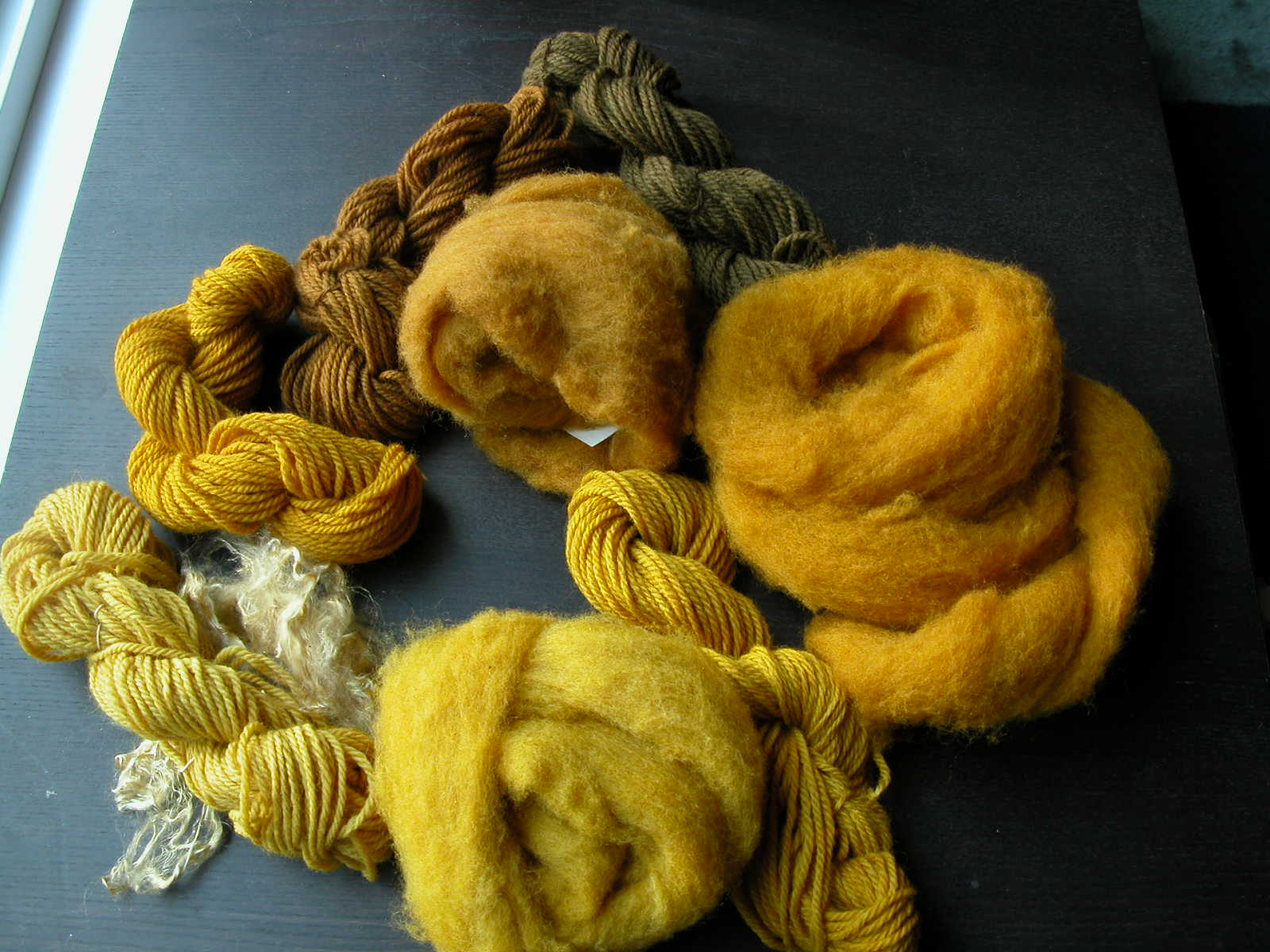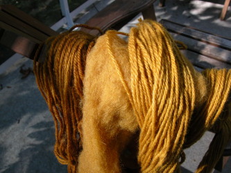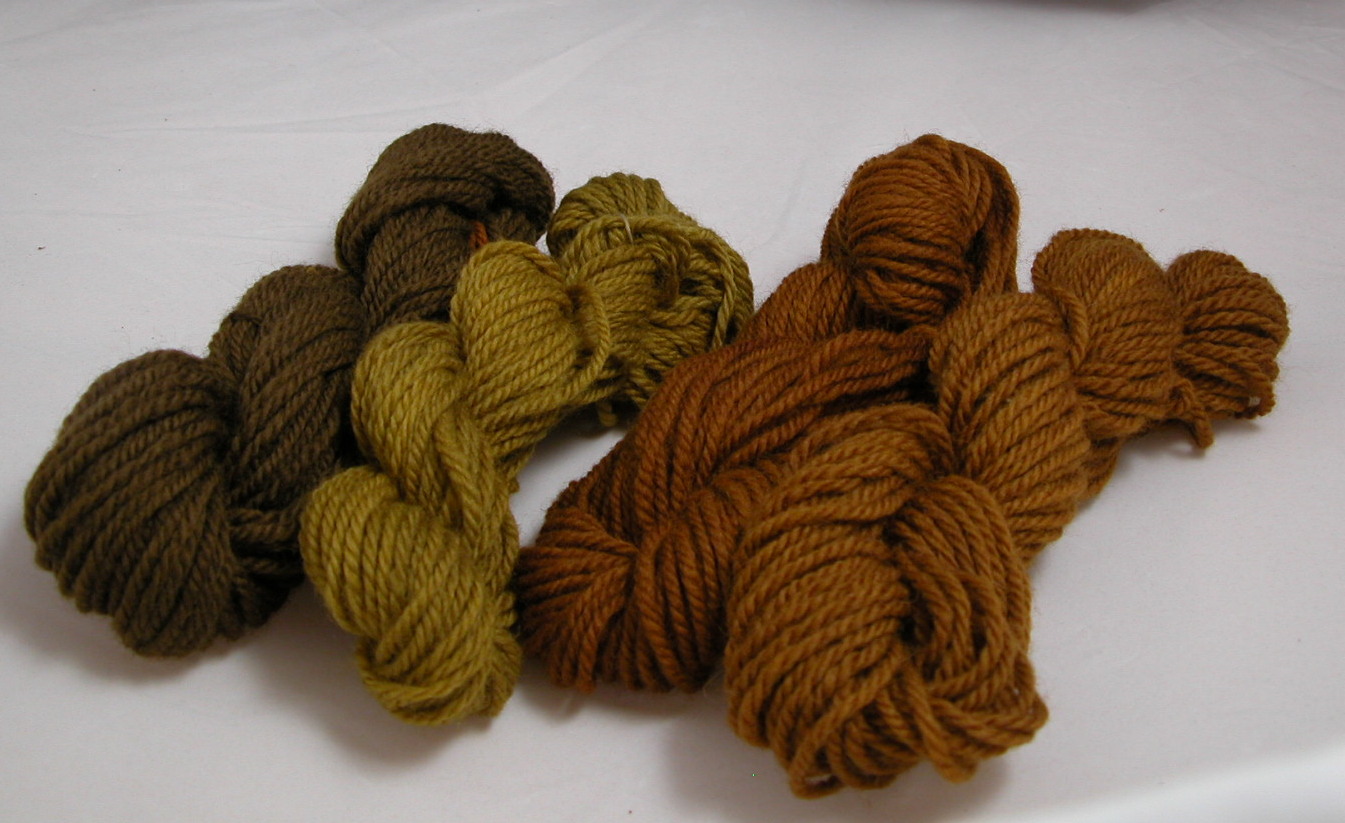 The brown skeins were treated with copper; again, the darker one on the left was mordanted before dyeing, while the lighter one was immersed in a copper afterbath.