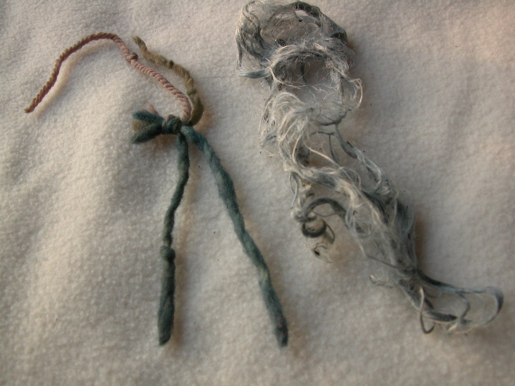 Even if I did, however, it’s unlikely the blue would retain its intensity forever. The little sample of greenish yarn on the left is some that I spun two years ago from wool that started out the same blue as the coil of fibre I have here. I’ve noticed this before with pieces I’ve knit from Sarcodon handspun— it’s best to savour the blue while it lasts, in expectation that it will eventually evolve into a pleasant, earthy green.
