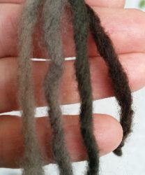 The next sample started off purple, but I hung it out in the sun to dry, so the outer layer of the roving turned a light brown. This also happened when I hung a sample out to be rained on; from now on I’m letting these dry inside in the shade.