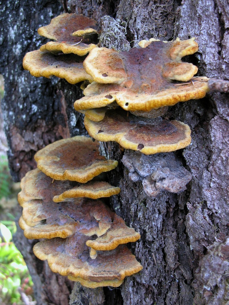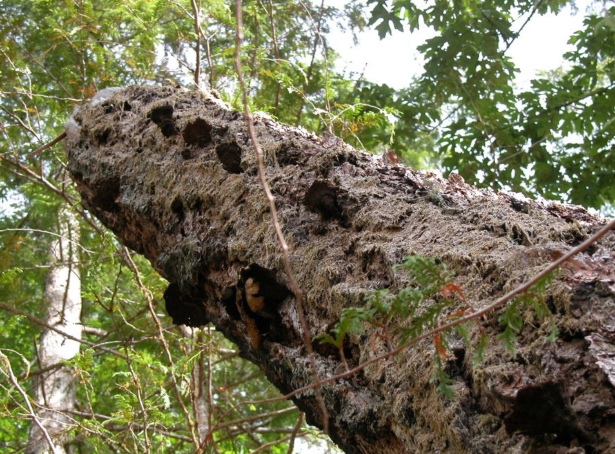 I went to check out my “nurse tree” for Dyer’s Polypore. From the number of old specimens still clinging to it (see the brown “bumps” running up the trunk, all well above my reach), it’s clear this old snag must be riddled with the mycelium of Phaeolus schweinitzii.