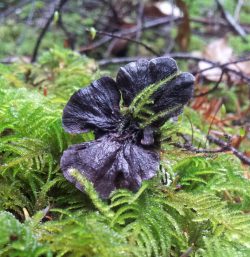 When I first learned about this mushroom, it was classed as a Paxillus, so I still refer to it by its familiar nickname, Velvet Pax. It’s an easy mushroom to identify because of its brown velvet stem and the cap that grows off centre, with inrolled edges. I find it on rotting Douglas fir stumps and logs; sometimes it appears to be growing out of the ground, in which case it’s actually growing out of a root. I’ll find a few early specimens in July or August, but they really come into their own with the fall rains. Slugs seem to find them irresistible, so if I find a button that I can come back to in a few weeks, I’ll pack dry ferns and little sticks around it, to give it a chance to grow.